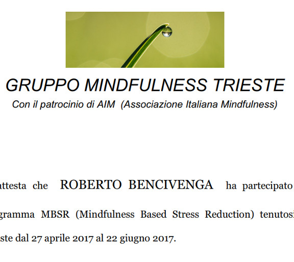 Partecipazione al corso MBSR (mindfulness based stress reduction - riduzione dello stress basata sulla mindfulness).